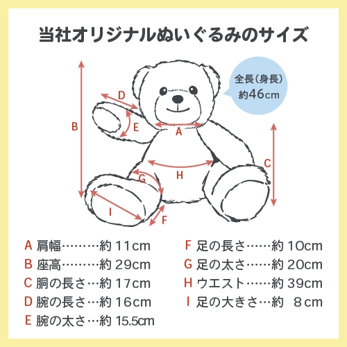 サイズ:全長(身長)約46cm、肩幅約11cm、座高約29cm、胴の長さ約17cm、