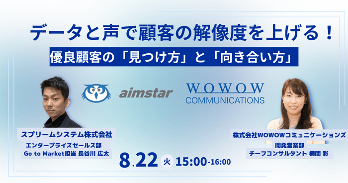 そこで、本セミナーでは、Engagement Data Platform「aimstar」を提供しているスプリームシステム株式会社が「顧客データ」に基づく「優良顧客の見つけ方」、WOWOWのファンボイスを提供している株式会社WOWOWコミュニケーションズが「顧客の声」を活用した「優良顧客との向き合い方」をご紹介します。