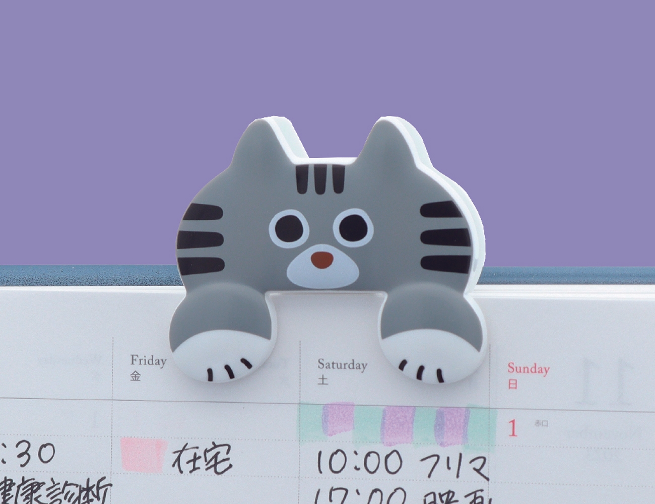 ネコがじぃ~っと見つめながら紙を留めてくれるから『ジットメ』と名付けました。ネコの習性をクリップで表現しており、じぃ~っと見つめる顔が愛らしいかわいいダイカットクリップ。人気のネコモチーフで、勉強やお仕事シーンでもついつい見つめ合っちゃう、癒しの文房具アイテム。