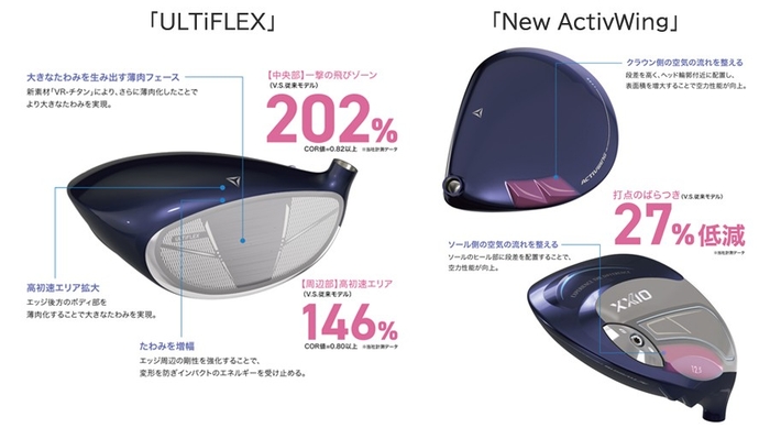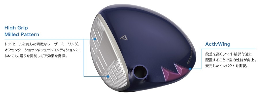 また、クラウン側の突起に加え、ソール側にも段差を設けた「New ActivWing(ニュー アクティブウイング)」により空力性能がさらに進化。空力がダウンスイング前半の「遠心力」によるヘッドのブレを抑制し、芯を捉える安定したインパクトを実現します。