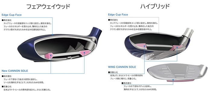 フェアウェイウッド、ハイブリッドともに、クラウン部が大きなたわみを生み初速性能が向上した「Edge Cup Face(エッジカップフェース)」を搭載。高初速化と低重心化を可能にしたフェアウェイウッドの「New CANNON SOLE(ニューキャノンソール)」、ハイブリッドの「WING CANNON SOLE(ウイングキャノンソール)」との組み合わせにより、さらなる高初速・高弾道を実現しました。