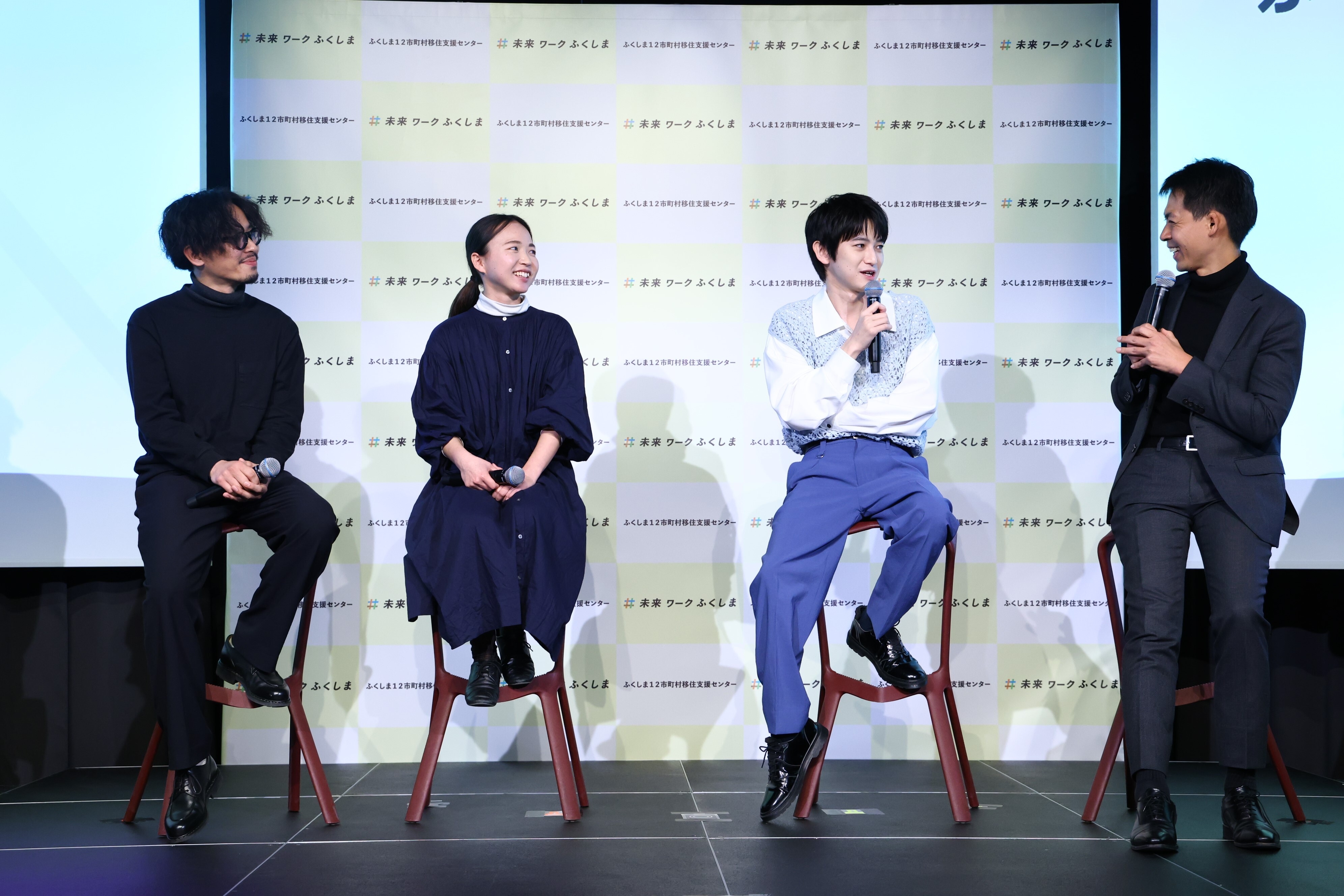 イベントの冒頭では、ふくしま12市町村移住支援センター センター長 藤沢烈より、「ふくしま 12市町村」の移住の現状について説明。次に、本郷奏多さんをお招きし、移住を軸に“先輩移住者”“グルメ”“先端技術”の3つのテーマで制作したドキュメントムービーのダイジェスト版をお披露目しました。その後のトークセッションでは、動画に出演する先輩移住者の方と一緒に動画を振り返りながら、本郷さんに今回の旅で出会った人たちを通して感じた、同地域の魅力などについてお話しいただきました。