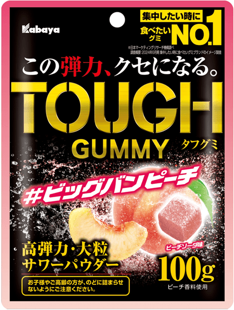 『タフグミ ビッグバンピーチ』は、食べ始めから食べ終わりにかけて酸味と甘みのメリハリをつけることで、無限に食べ続けたくなるような連食性を追求しました。『タフグミ』ならではのサワーパウダーの酸味・刺激に、ピーチ特有の芳醇な香りと甘さが相まって、飽きることなく完食できる美味しさとなっています。