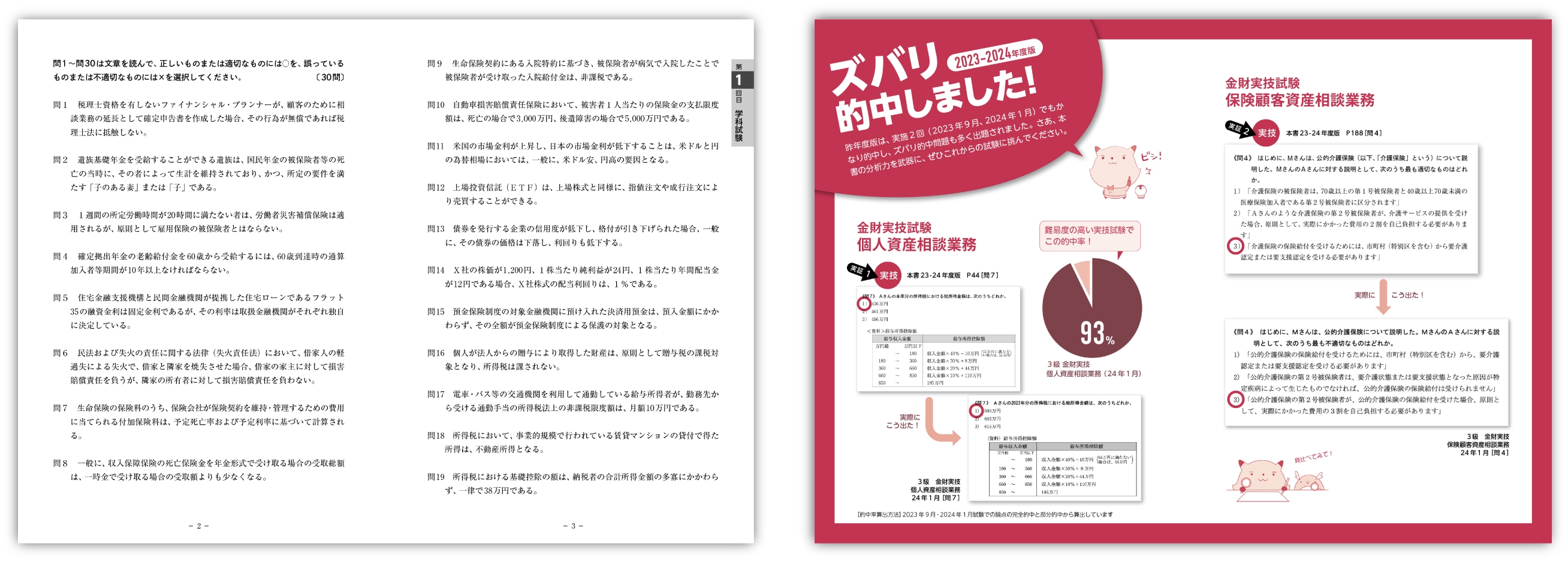 2024年5月27日に発売した『テキスト&問題集』はフルカラーのテキスト部分と厳選問題集部分がセットとなった一体型テキスト&問題集です。実技試験は、金財(個人資産相談業務・保険顧客資産相談業務)及び、日本FP協会(資産設計提案業務)に対応しています。