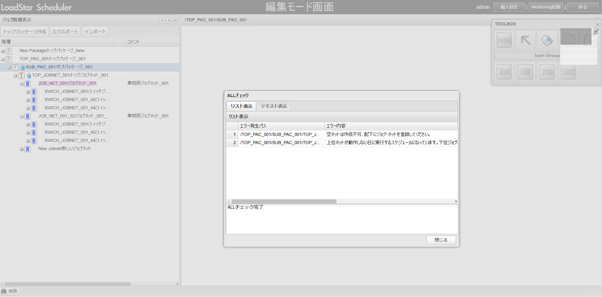 登録した定義内容を解析し、スケジュールの論理矛盾やジョブ実行先サーバーの存在確認などをジョブ実行前に確認することができます。これにより、ジョブ環境構築後の確認及び初期の動作テスト時間を大幅に削減することができます。