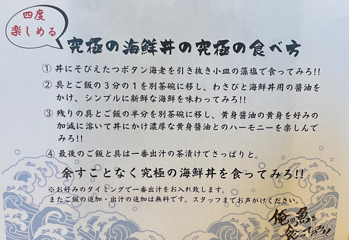 新鮮な海の幸をたっぷりと詰め込んだ海鮮丼は、はじめにこだわりの藻塩でボタンエビの甘みを楽しんだ後、海鮮丼専用の出汁醤油でシンプルに、次に濃厚な黄身醤油と食べ進め、そして最後はカツオの一番出汁の茶漬けにしてさっぱりと。最後まで飽きることなく楽しむことができるよう食べ方にもこだわりの詰まった海鮮丼です。