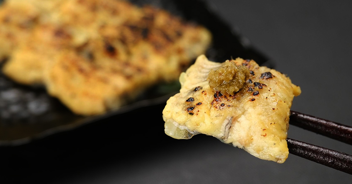 調理は電子レンジで温めるだけで美味しく召し上がれますが、フライパンで軽く焼き目をつけると香ばしさが増し、さらに格別な味わいに。店主・椎名が「無限ループ」と称するおすすめの食べ方は、付属の生青柚子胡椒を乗せ、お気に入りの純米酒と合わせるスタイルです。
