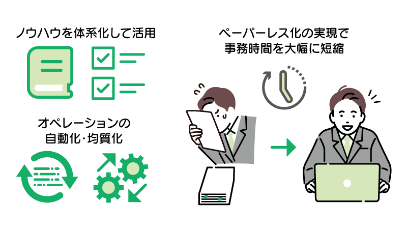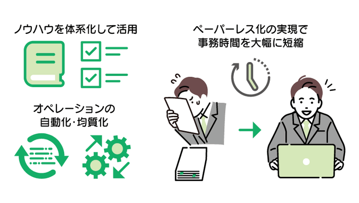 「2in1諸届窓口受付システム」では、金融機関窓口における住所や口座名義の変更、通帳紛失といった諸届事務について、ヒアリングから必要な事務手続きを特定し、事務処理のプロセスを制御・統制、さらに勘定系連携による営業店端末レス化・オペレーションの自動化・ペーパーレス化を行うことで、事務コストを大幅に削減し、職員の業務スキルに依ることなく抜け漏れのない事務をサポートします。