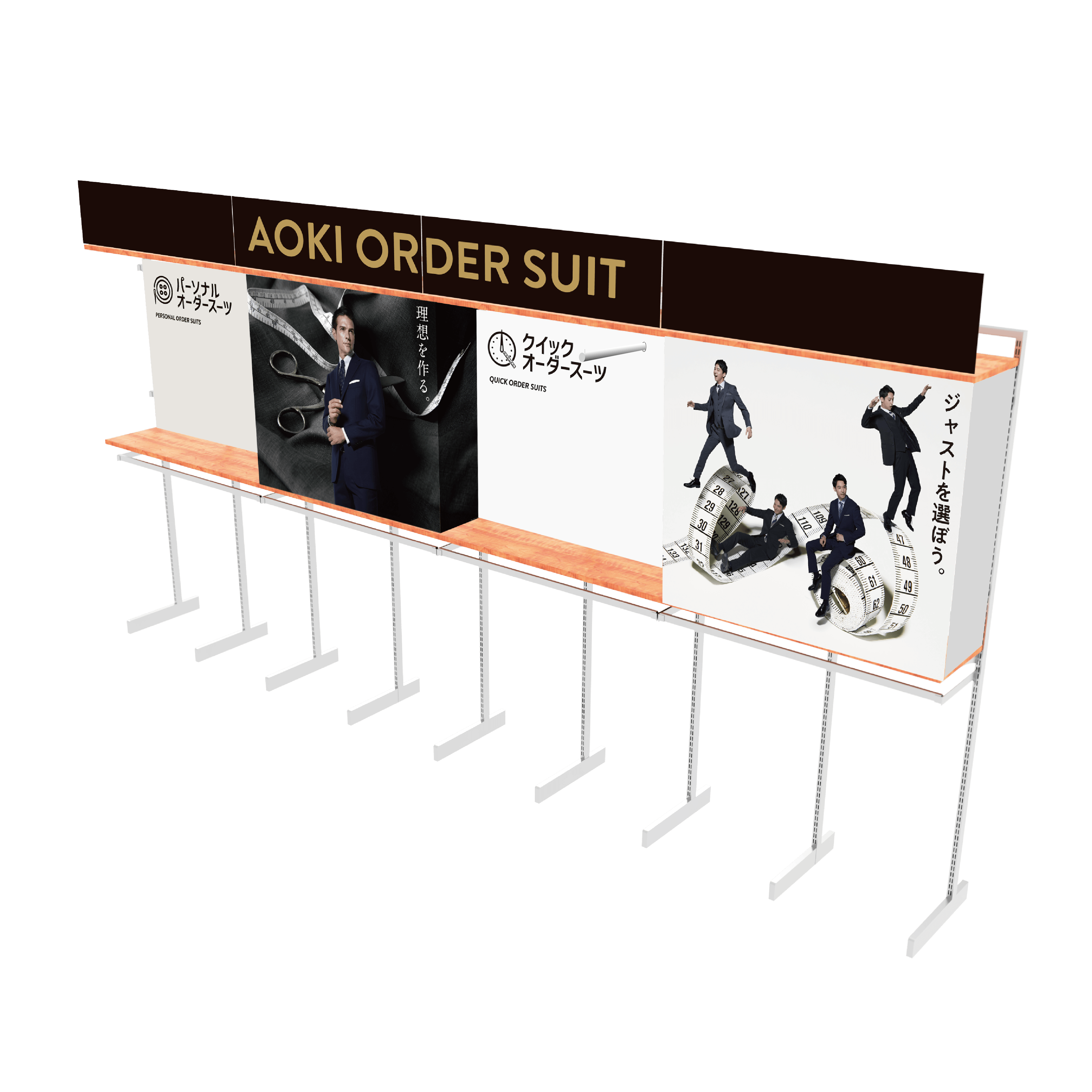 株式会社AOKI様のオーダースーツ売り場装飾に採用された実績をもとに、店舗ごとにサイズのカスタマイズが可能な仕様にてご提供。店舗のスタッフ様が簡単に設置できるため、全国規模の展開にも最適です。今後も、店舗プロモーションにおける新しい価値を提供し続けてまいります。