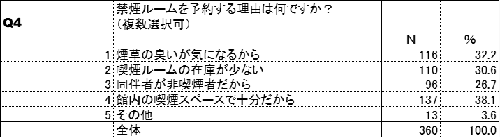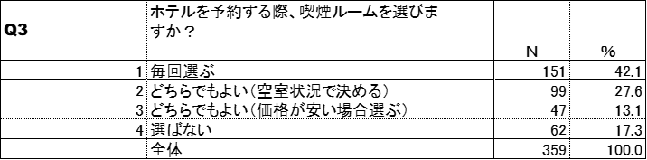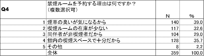 - 喫煙ルーム選択状況と禁煙ルーム選択理由を聞いたところ、以下の結果となりました。