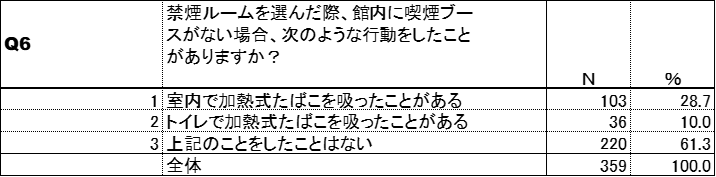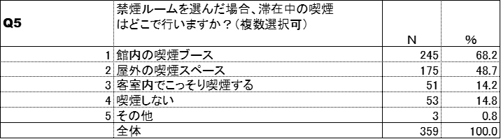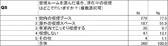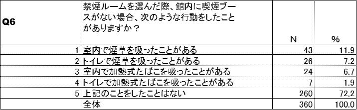 - 禁煙ルーム利用時の喫煙場所と禁煙ルーム内での喫煙経験を聞いたところ、以下の結果となりました。