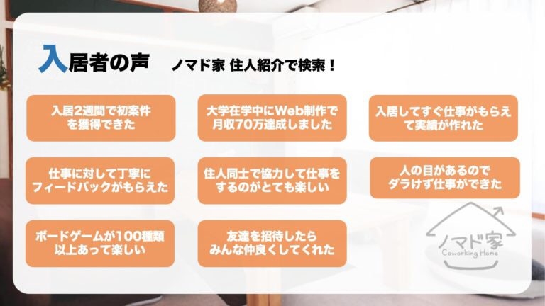 ノマド家は、現在空室待ち40名以上、オープン当初から入居率100%を継続しているフリーランス向けのシェアハウスです。