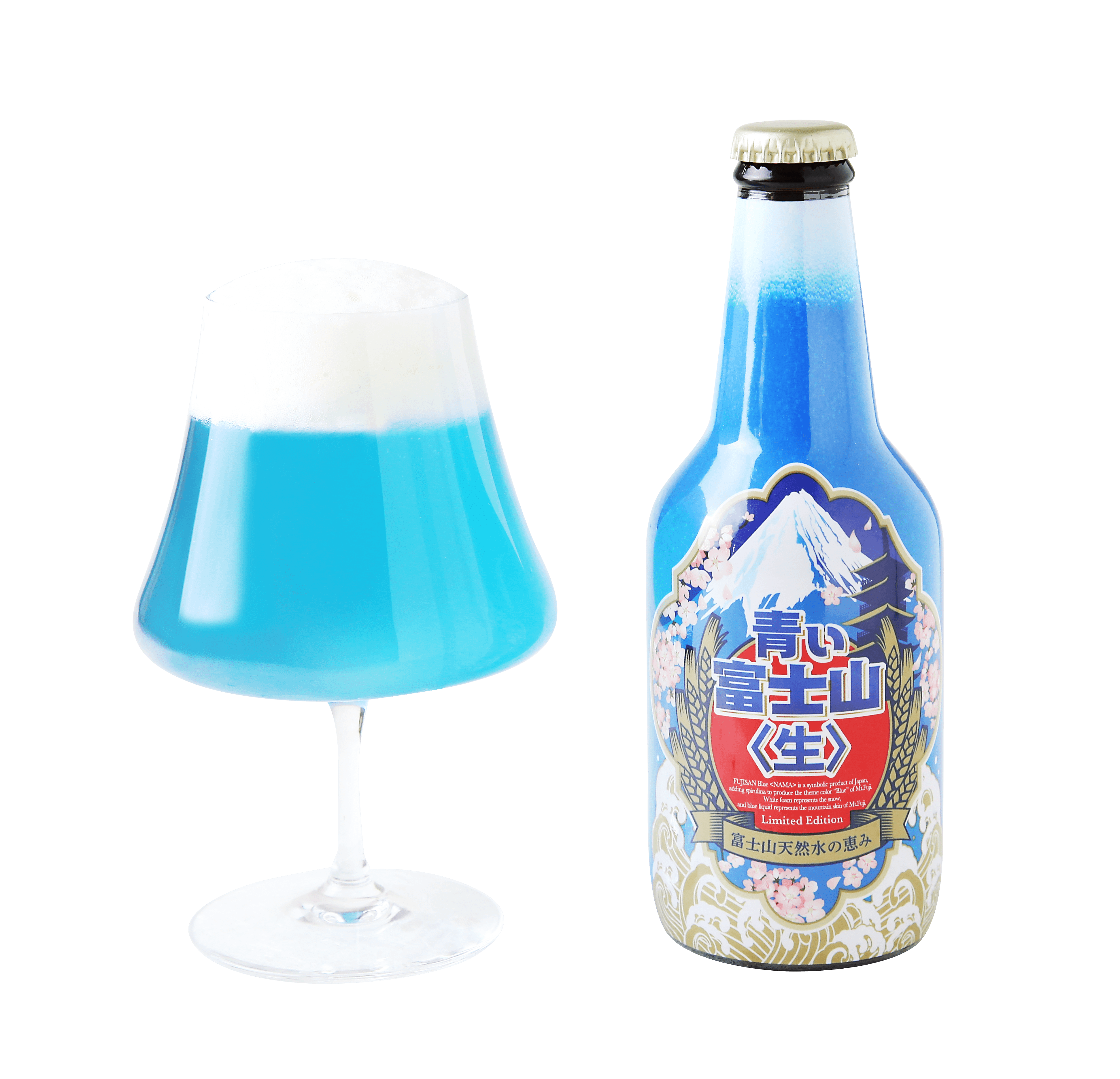 試行錯誤を重ね、富士山の山肌を思わせる美しい青色を飲料の液種で再現。富士山の雪を泡で表現しています。また、仕込み水には富士山の天然水を使用。
