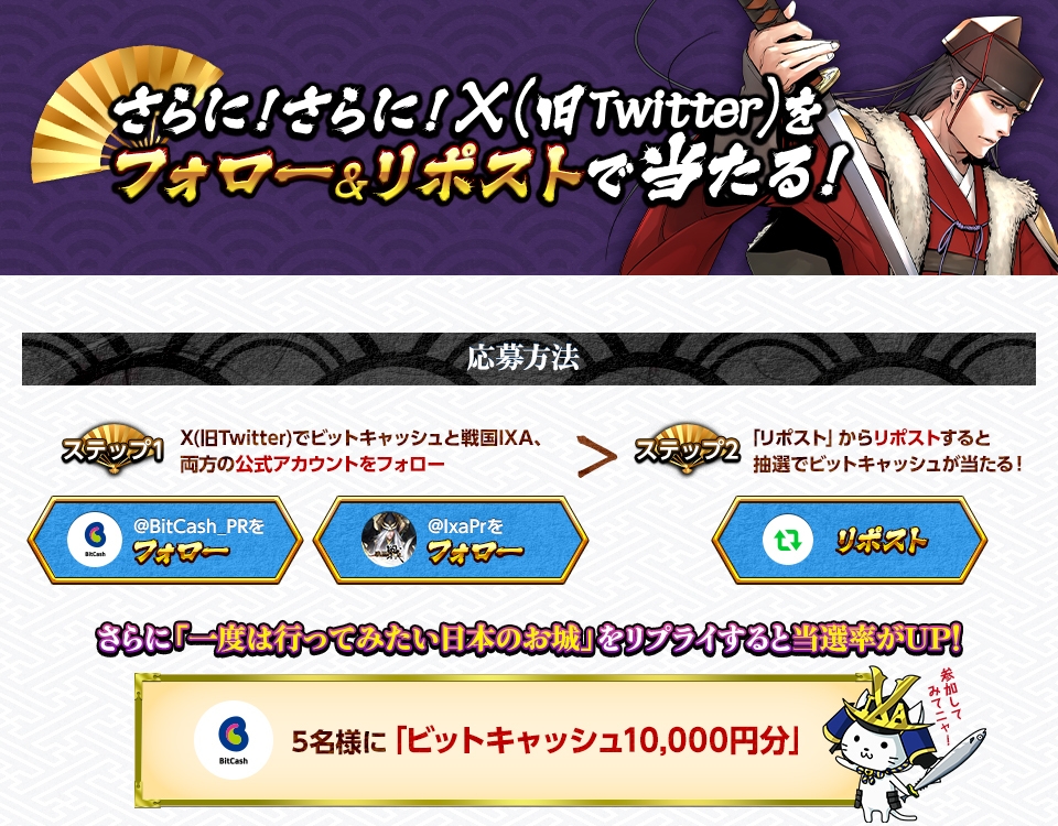 期間中、X(旧Twitter)アカウント「@BitCash_PR」及び「@IxaPr」の両方をフォローし、対象ポストをリポストすると抽選で5名様にビットキャッシュ10,000クレジットが当たります。