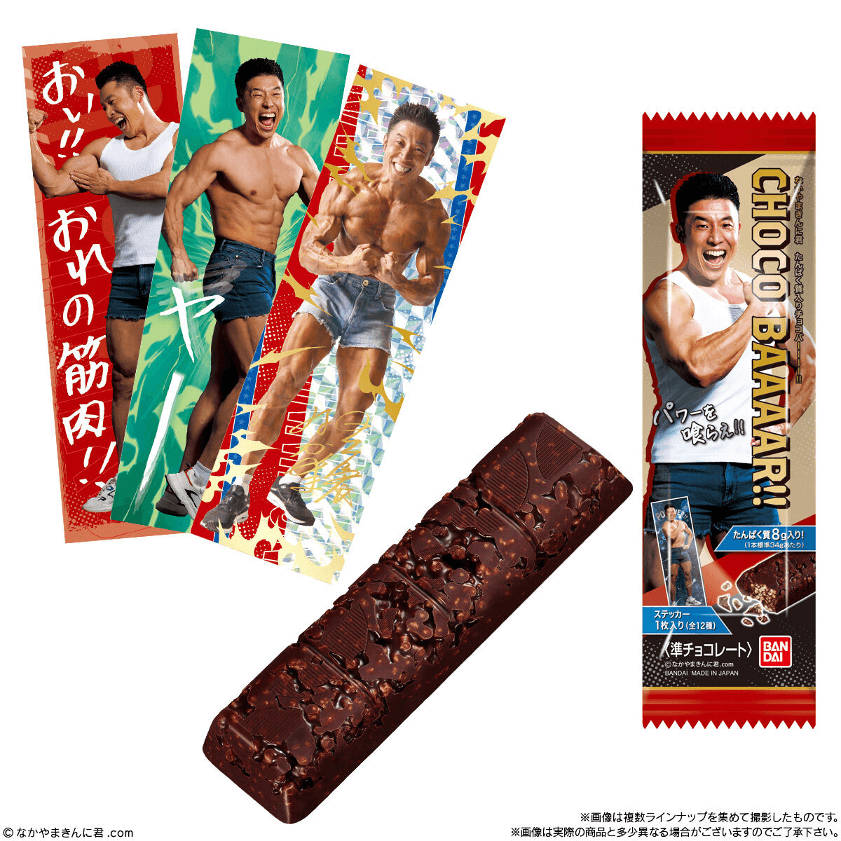 本商品は、大人気筋肉芸人「なかやまきんに君」の代表的なボディビルポーズの撮りおろし写真とお馴染みのフレーズを掛け合わせたステッカー付きのチョコレート菓子です。ステッカーの表面にはポージングが大きく写っていて、「なかやまきんに君」の肉体美を余すことなくお楽しみいただけます。