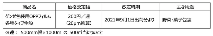 グンゼ株式会社(本社:大阪市北区、社長:佐口 敏康)は、プラスチックカンパニーが販売する包装用OPP(二軸延伸ポリプロピレン)フィルムについて、2021年5月10日付で公表した価格改定に引き続き、新たに追加で価格改定を実施することを決定しましたので、お知らせいたします。