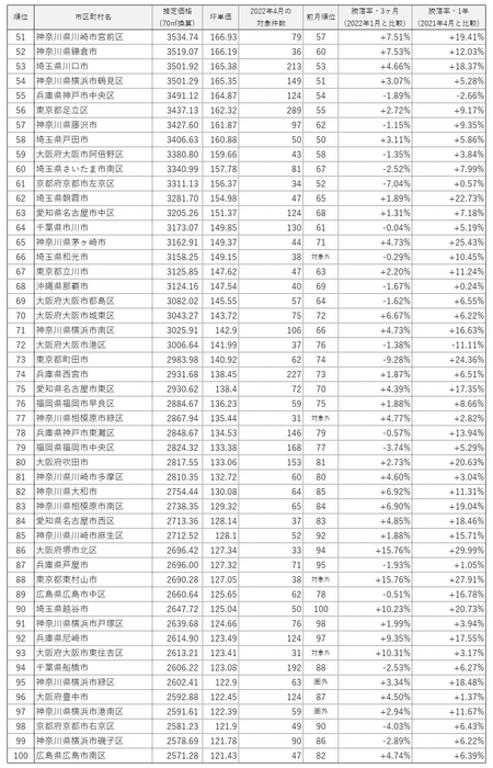 ・推定価格が100位以内の市区で、前年(2021年4月)と比較して価格が上昇したのは94市区。また、3ヶ月前(2022年1月)と比較して価格が上昇したのは65市区。