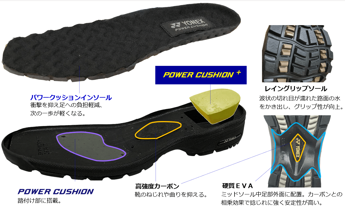 本製品ではミッドソールのかかと部に「パワークッションプラス」を新たに搭載。シューズのねじれ曲がりを抑える高強度カーボンによる安定性にクッション性を加え、さらに疲れにくく、歩きやすくなりました。