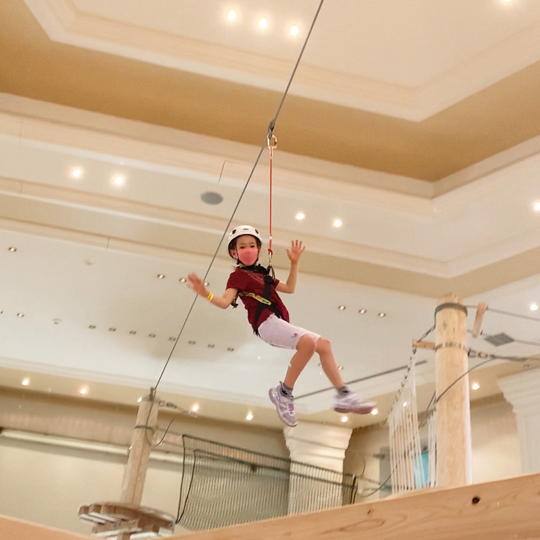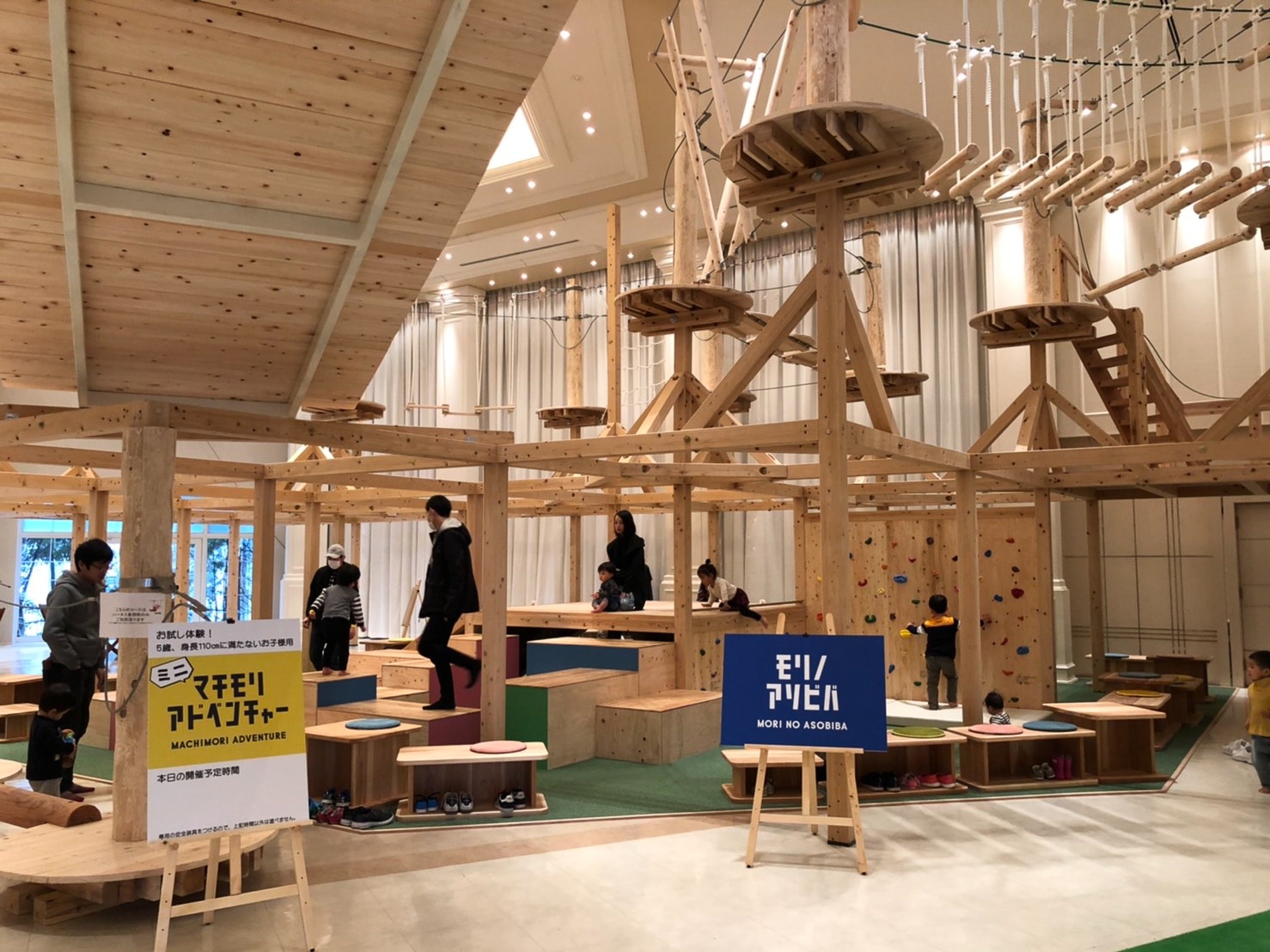 福岡県久山町にある商業施設「トリアス久山」内にある、室内アドベンチャーパークです。国産材をふんだんに使い、室内でも森にいるかのような香り、ぬくもりを感じられる施設となっています。屋内の1階は「モリノアソビバ」として、小さなお子様を持つ家族が楽しめる空間、2階は「マチモリアドベンチャー」として、本格的な空中アスレチック体験ができる施設となっています。