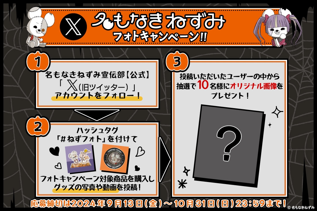 名もなきねずみ宣伝部【公式】Xアカウントより、当選者へのみ10月中旬頃にDMでご連絡いたしますので、応募された方はフォローを外さないようお願いいたします。