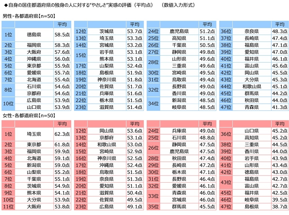 “やさしさ”実感の評価が高い都道府県 1位「福岡県」59.1点、2位「東京都」58.9点、3位「埼玉県」57.8点