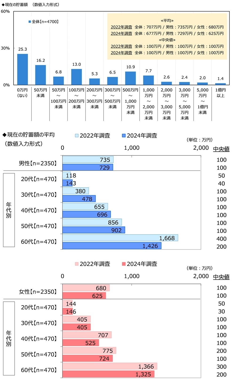 現在の貯蓄額を聞くと、平均は677万円。また、貯蓄額がない人の割合は25.3%でした。