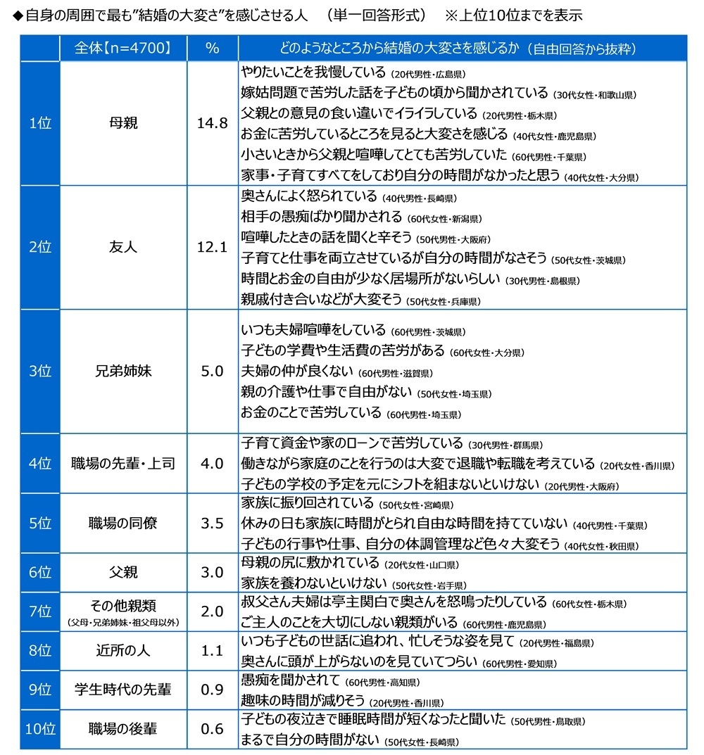 反対に、自身の周囲で最も“結婚の大変さ”を感じさせる人を聞いたところ、1位「母親」(14.8%)、2位「友人」(12.1%)、3位「兄弟姉妹」(5.0%)、4位「職場の先輩・上司」(4.0%)、5位「職場の同僚」(3.5%)となりました。