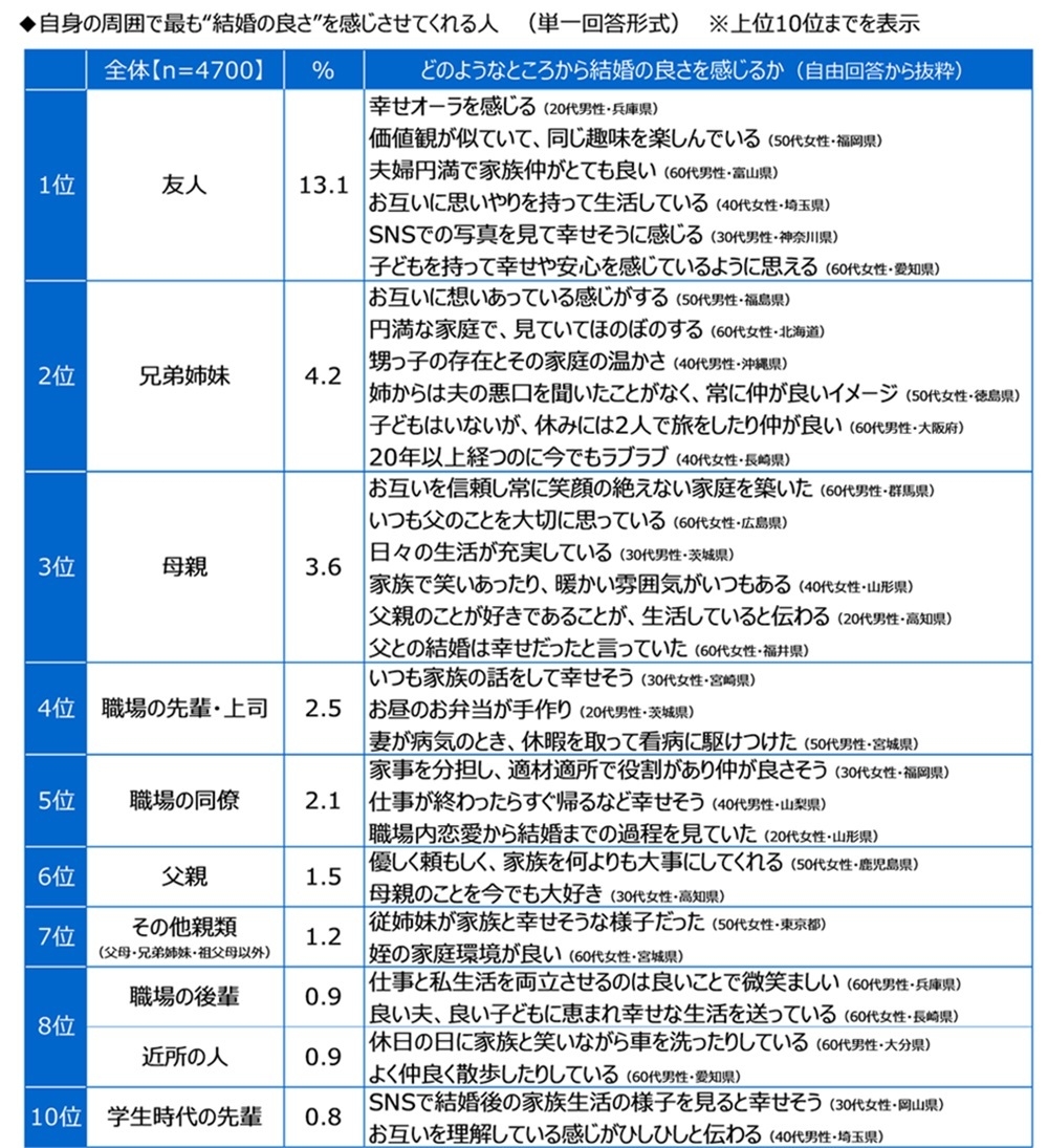 どのようなところから結婚の良さを感じるか聞いたところ、1位の「友人」では「幸せオーラを感じる」や「価値観が似ていて、同じ趣味を楽しんでいる」、「SNSでの写真を見て幸せそうに感じる」、2位の「兄弟姉妹」では「甥っ子の存在とその家庭の温かさ」や「姉からは夫の悪口を聞いたことがなく、常に仲が良いイメージ」、「20年以上経つのに今でもラブラブ」、3位の「母親」では「家族で笑いあったり、暖かい雰囲気がいつもある」や「父親のことが好きであることが、生活していると伝わる」、「父との結婚は幸せだったと言っていた」といった回答がありました。