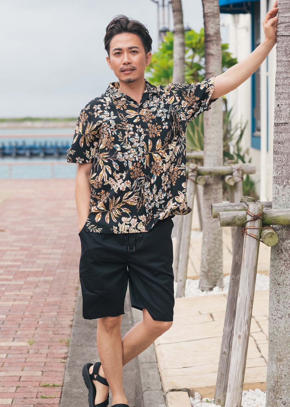 同柄のシャツと合わせたセットアップコーデは、沖縄の海にも街にもよく映えるイチオシスタイル。