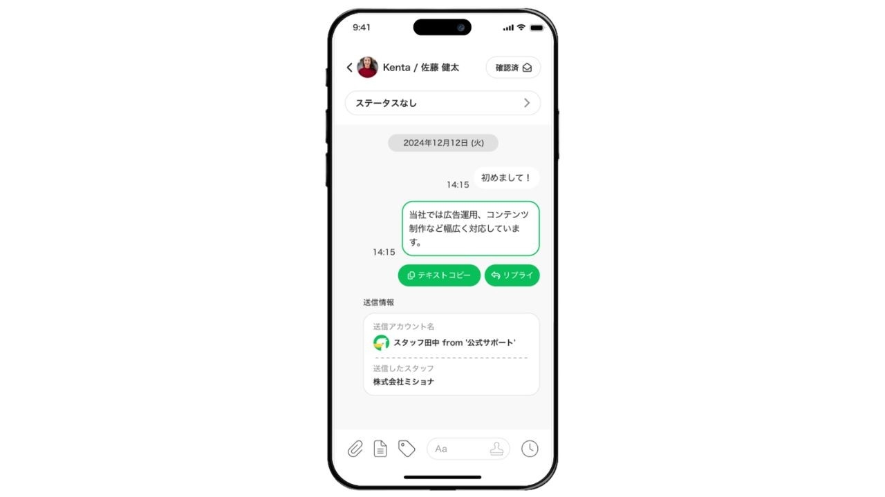 株式会社ミショナ提供のLINE公式アカウント拡張ツール「L Message(エルメッセージ)」は、スマホアプリでも利用可能。 外出中でもトーク内容や対応状況を確認したり、メッセージを送信したりできます。