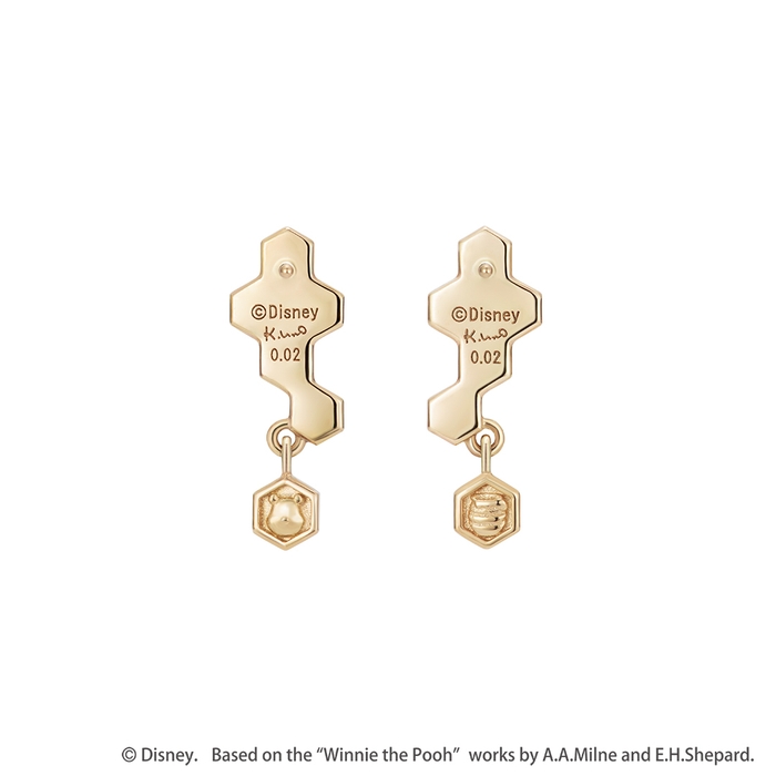 ハニカムモチーフが連なったデザインのピアス。一番下のハニカムチャームには、さりげなく輝くメレダイヤモンドを。チャームの裏には、「プーさん」とハニーポットのモチーフをデザインしました。K10イエローゴールドは肌なじみが良く、身に着けやすいカラーです。