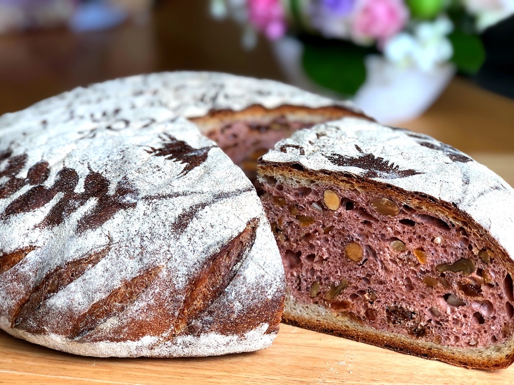 いっしょう円満パンの中身にたっぷりのフルーツとナッツ、そして紅い生地と白い生地で紅白と縁起良く仕上げた豪華バージョン!ライ麦入りの生地で【円満】になるように大きく丸く焼きあげます。いっしょう=一升・一生・一笑・一勝などの願いを込めてお祝い事や一升餅のかわりに人気の商品です。1歳のお誕生日、結婚記念日、長寿のお祝いなど、一生に一度の大切な記念日ですので、完全オーダーメイドになります。一緒に最高の記念日をおつくり出来るようにデザイン・メッセージ内容や名前入りなどのメッセージでやり取りさせていただきます。