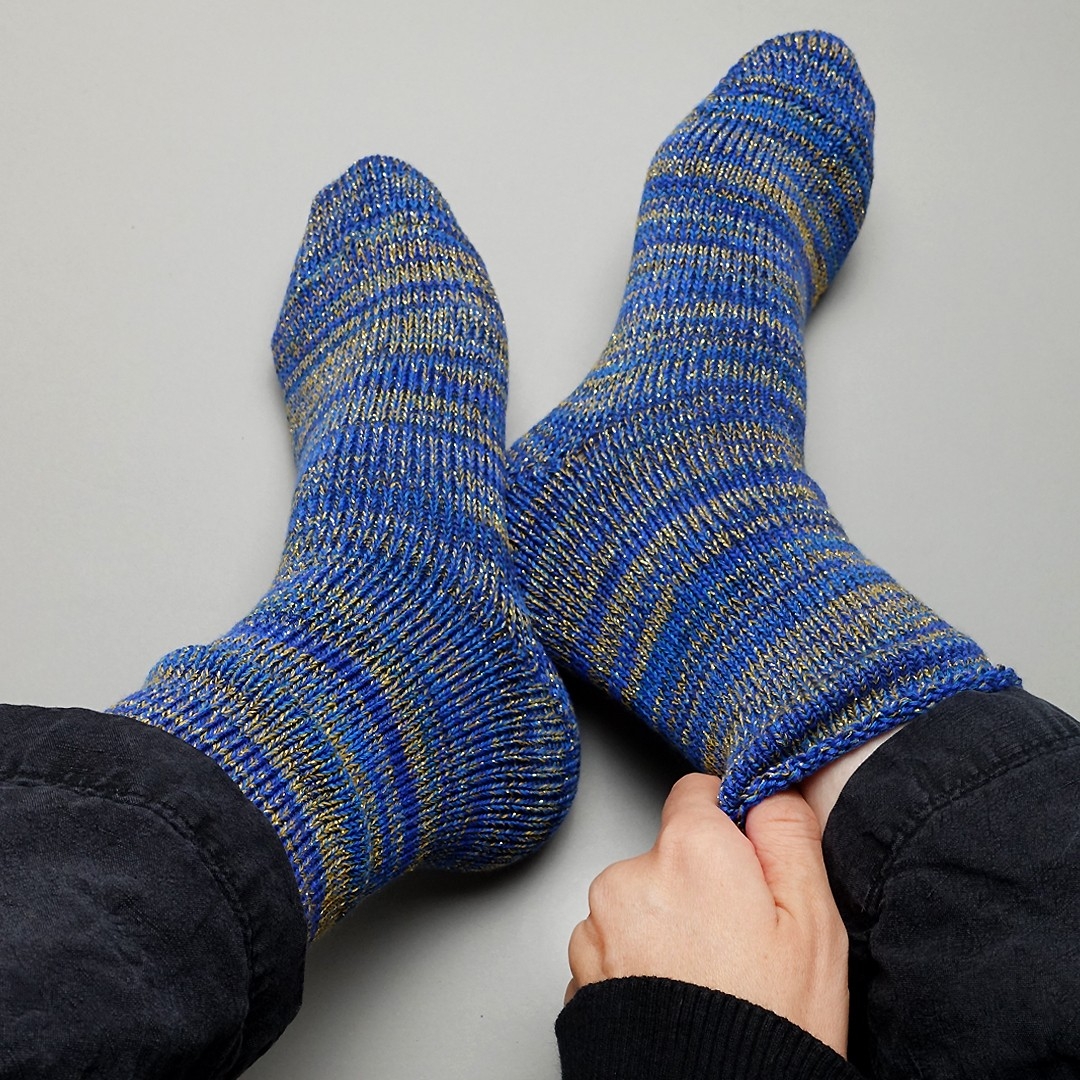 自転車を漕ぐ力で靴下を編む「チャリックス」(https://www.charicks-online.jp/)にも使われている、希少なヴィンテージの靴下編機を使用し、「瑠璃坏」から着想を得た色の糸を束ねて編みあげています。同じ色の糸を使いながらも、一足一足違う色合い・模様の妙を、ぜひお楽しみください。