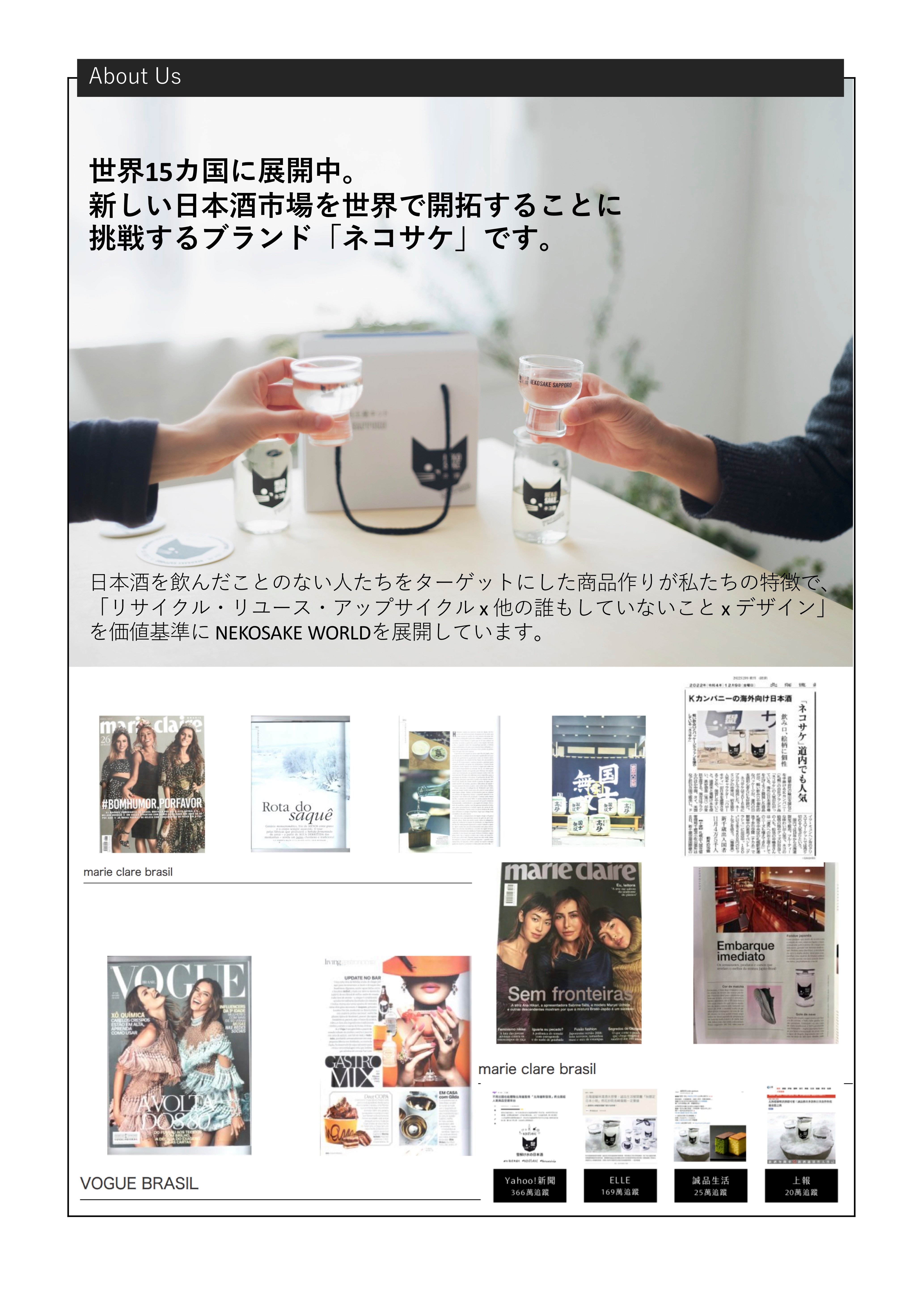 海外向けに立ち上げた「#北海道産超軽口雪解け水日本酒」の「ネコサケ」ブランドは、現在世界15カ国に展開中ですが、よい日本酒が簡単に手に入る日本での展開予定は当初はありませんでした。ですがお客様の声を受けて2019年より北海道限定の国内展開を始めてからは、国内でも軽めで低アルコールの日本酒ニーズが大きいことに気がつきました。