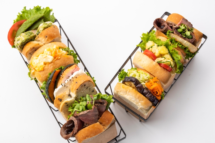 タマゴサンド、野菜サンド、自家製ローストビーフサンド、自家製鶏ハムとバジルのサンドなど約10種類のサンドは、地元産の野菜・食材をふんだんに使い、中の素材に合わせてプレーンの食パン以外にゴマ食パンや胚芽食パンも使用。