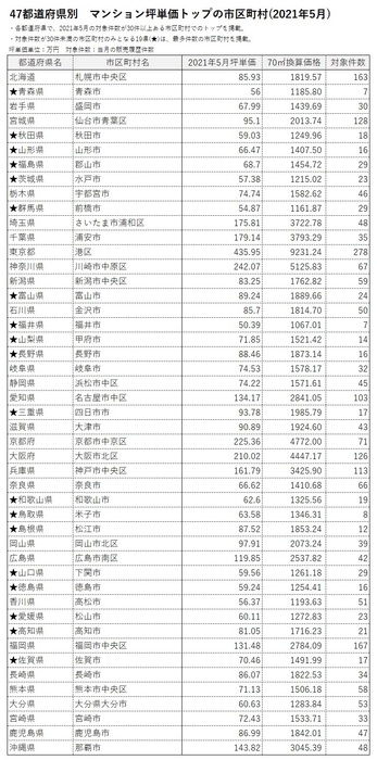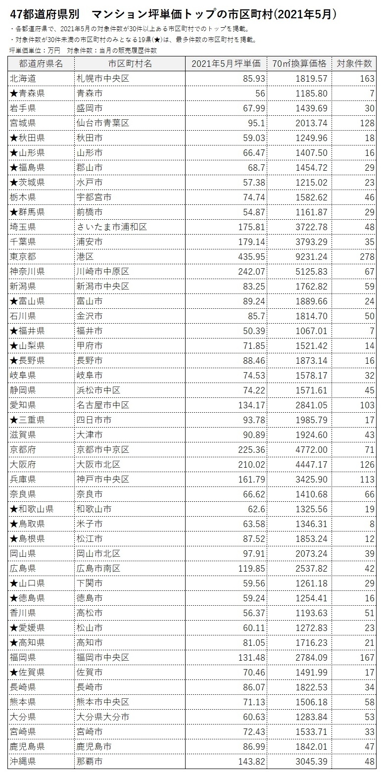 ■47都道府県 マンション坪単価 トップの市区町村(2021年5月)