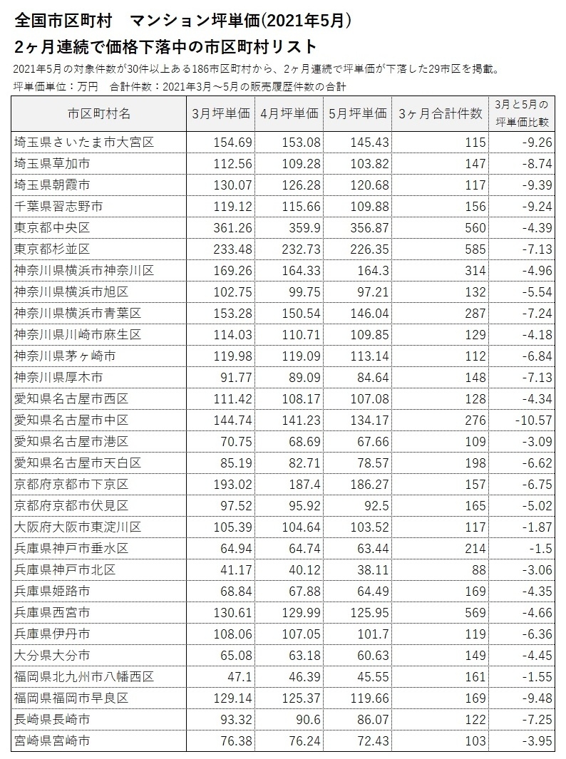 ・2021年3月から2ヶ月連続で下落したのは29市区。