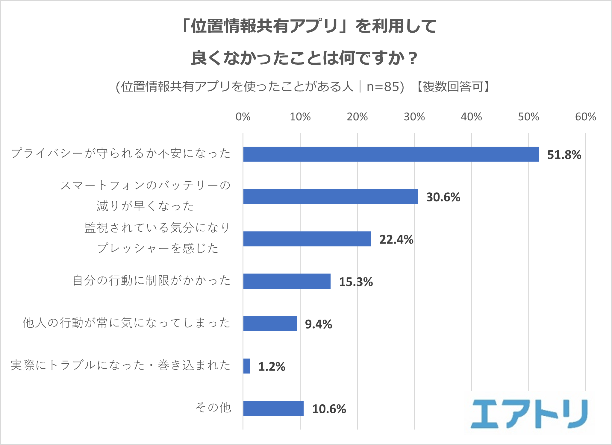 位置情報共有アプリを使ったことがある人に利用して良くなかった点を聞いたところ、51.8%の人が「プライバシーが守られるか不安になった」と回答しました。次に「スマートフォンのバッテリーの減りが早くなった」が30.6%、「監視されている気分になりプレッシャーを感じた」が22.4%という結果でした。