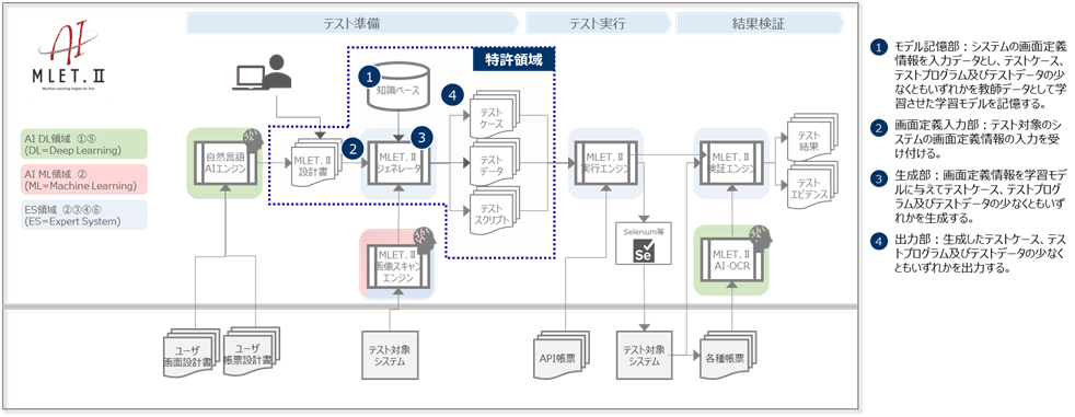 テキストボックスやボタン等、数十項目を含む画面設計書をMLET.IIにインプットすると、知識ベースから自動で1,000超のケースやテストデータが瞬時に作成され、自動実行され、エビデンスも自動で出力されます。