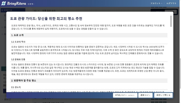 「記事本文作成ボタン」を押すと10分ほどでSEOに強い記事が生成されます。生成された記事は保存され、いつでも呼び出すことができます。HTMLコピーすればWordPressにHTMLの書式が反映されたまますぐに貼り付けることができます。