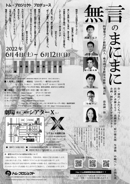 トム・プロジェクト(東京都渋谷区)主催、トム・プロジェクト プロデュース『無言のまにまに』が2022年6月4日 (土) ~2022年6月12日 (日)に東京・両国 シアターΧ(東京都墨田区)にて上演されます。チケットはカンフェティ(運営:ロングランプランニング株式会社、東京都新宿区、代表取締役:榑松 大剛)にて3月11日(金)10:00より発売開始です。