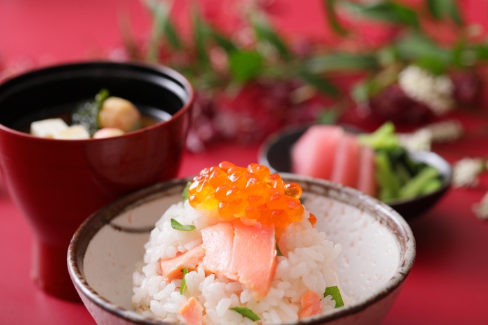 ・お好みで選んで頂く三種類御飯(鮭と大葉の炒めご飯 いくら添え/ 梅とシラス大葉の炒めご飯 / ガーリックライス)