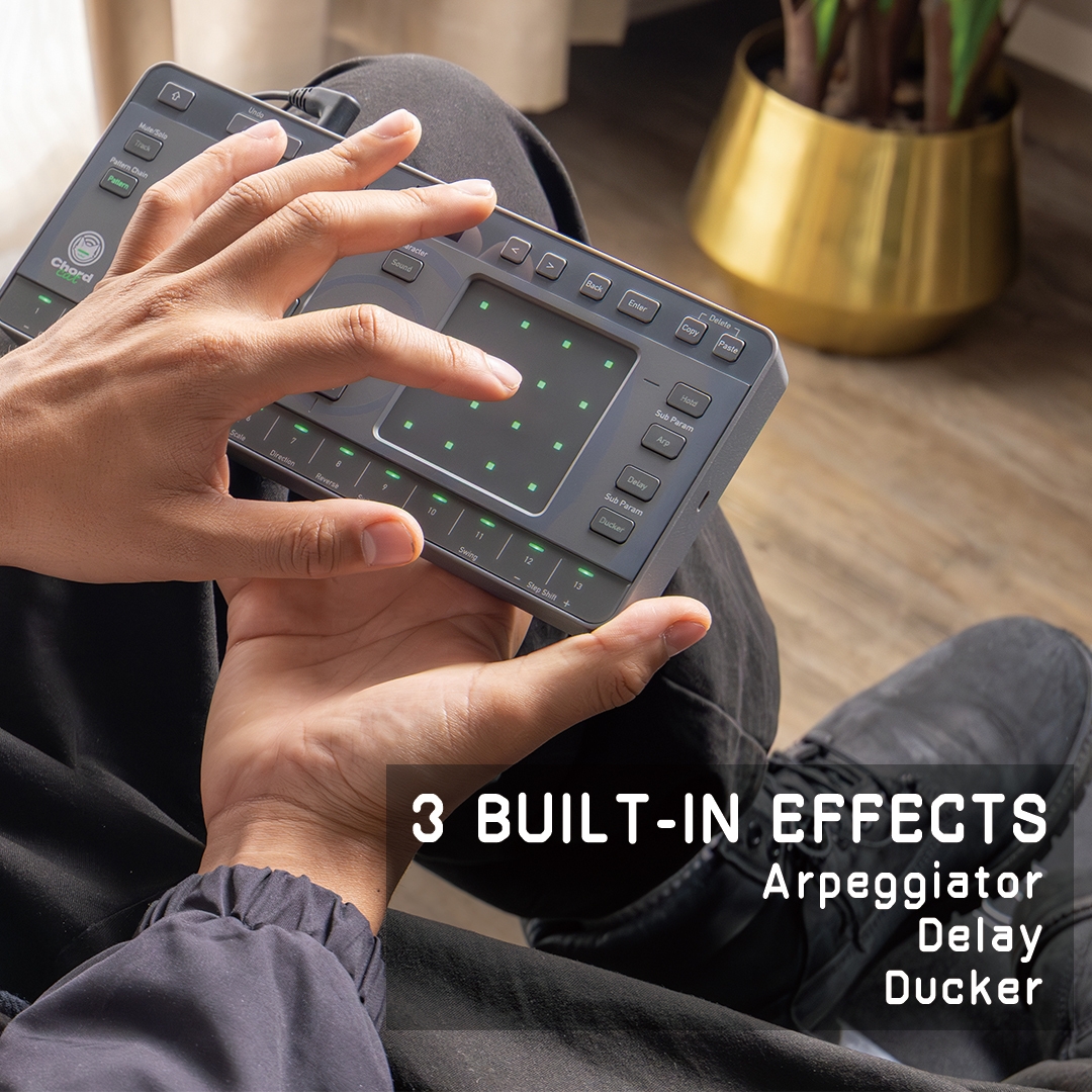 Chordcatでは、アルペジエーター、ディレイ、ダッカーの3種類のエフェクトを搭載しており、これらのエフェクトはXYパッドで直感的に操作できます。