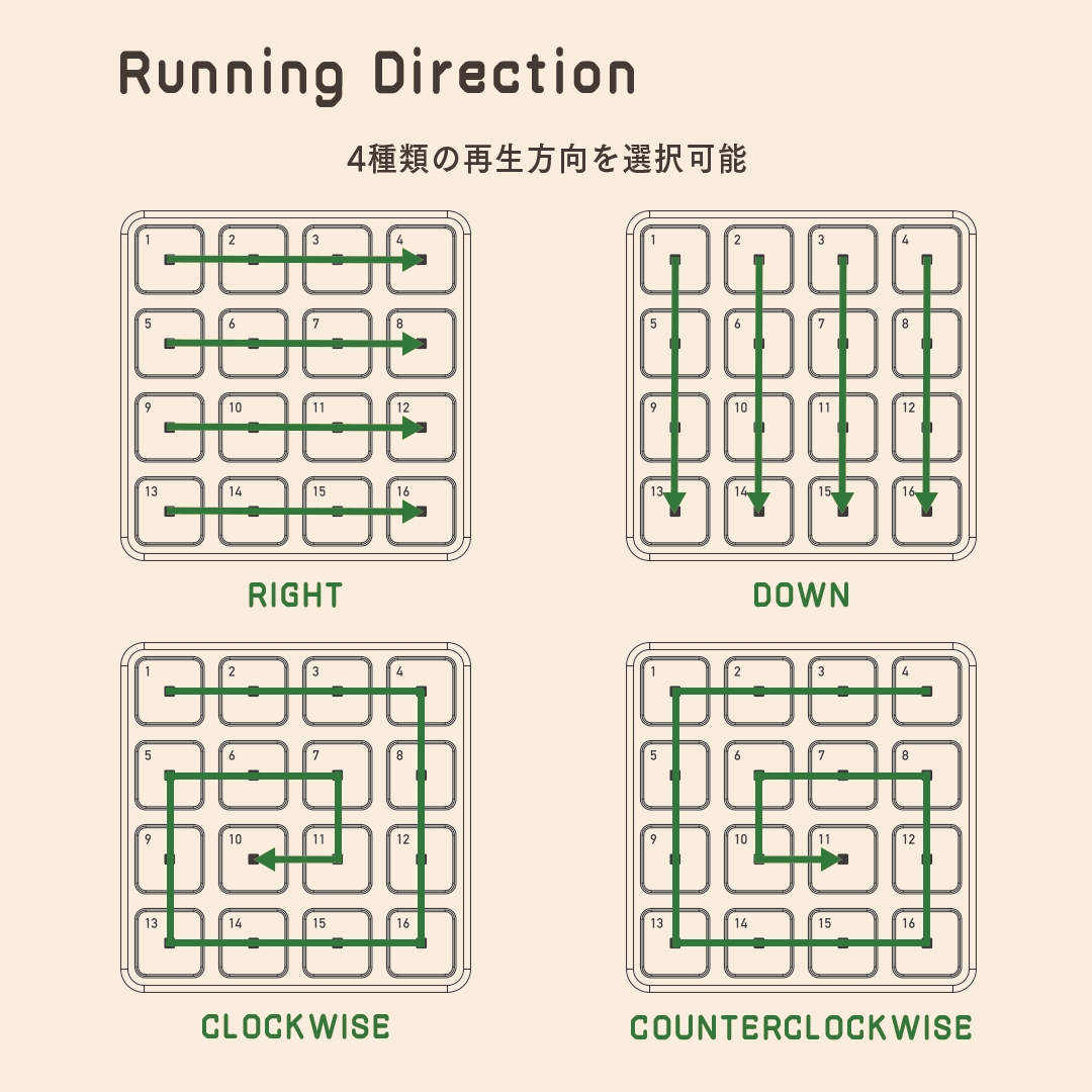 Chordcatは、4×4のステップボタンによるシーケンスパターンの再生方向を、ボタンひとつで切り替えることができる、ランニングダイレクション機能を搭載しています。再生方向はRight、Down、Clockwise、Counterclockwiseの4種類から選択可能で、予想外のフレーズやリズムが生まれ、新たなアイデアを引き出します。ランニングダイレクション機能を使うことで、新しいコード進行や異なるジャンルのリズムを生み出すなど、音楽制作の可能性をさらに広げることができます。