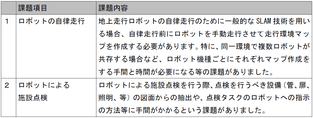 インフラ施設の老朽化や点検技術者不足を背景に、施設内設備点検の省力化が求められている中、ロボットによる施設点検の期待が高くなっているものの、実現に向けては下表のような課題があります。