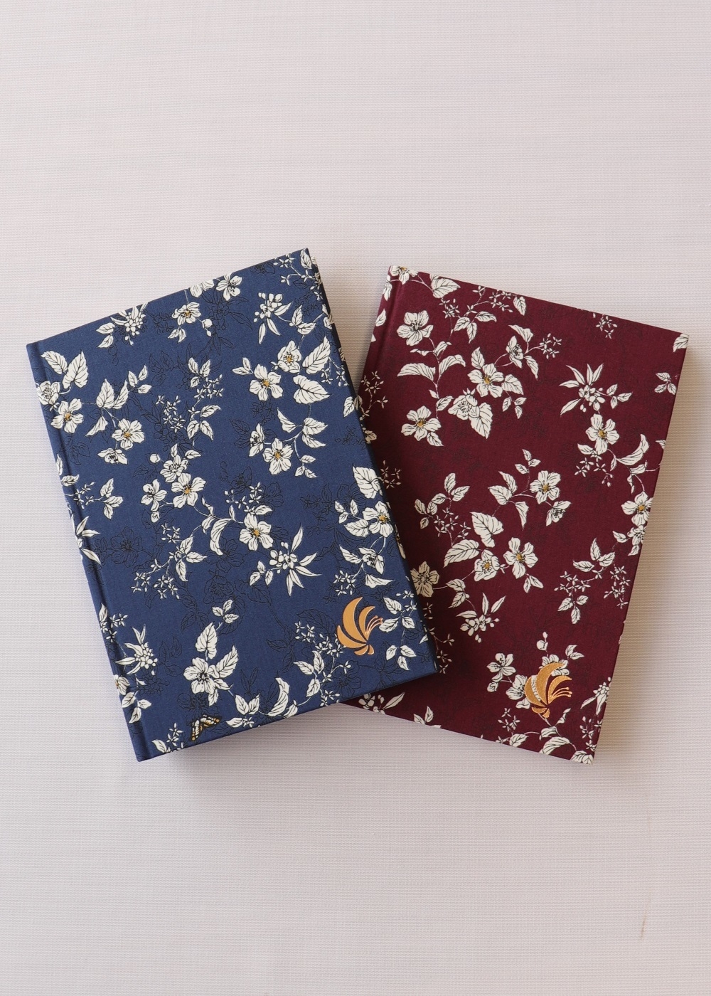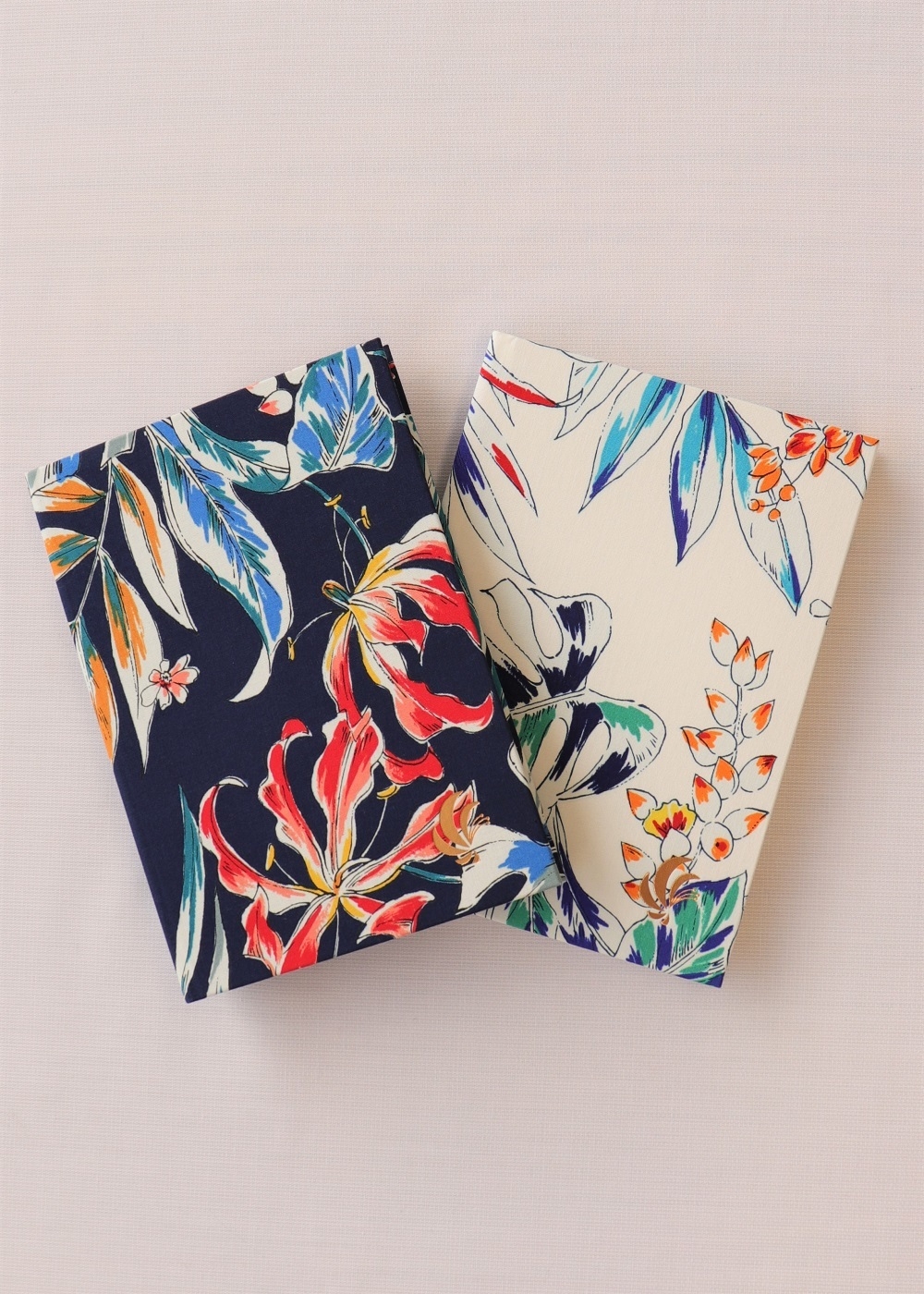 沖縄に自生する植物シマサルナシを中心にデザインしたボタニカルな小花柄。所々に花から花へと飛び回るフタオチョウを見つけるのも楽しみの1つ。シックな色合いで落ち着いた配色の1冊。