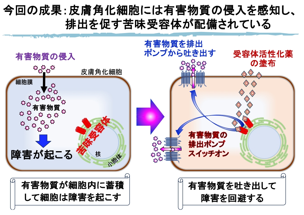 有害物質の中には苦味受容体が感知できない物質もあり、こうしたケースでは有害物質は細胞内に蓄積し、皮膚障害や炎症などの引き金になります(図参照)。今回の研究成果から、こうした細胞内に蓄積した有害物質は、人為的に苦味受容体を活性化して排出機構をオンにすれば、細胞外に排出できると考えます。無害で受容体を活発化できる薬剤は皮膚の保護剤や炎症治療薬として期待できます。
