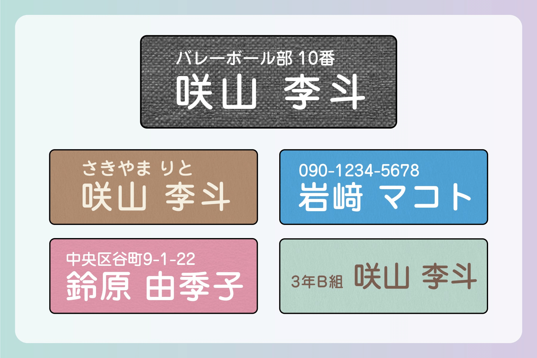 お名前の上段に任意の文字を入れて2段にすることもできます。お子さまのクラブ名等を入れるのはもちろん、電話番号や簡易な住所を入れておじいちゃん・おばあちゃんの持ち物につけておくのもオススメです。
