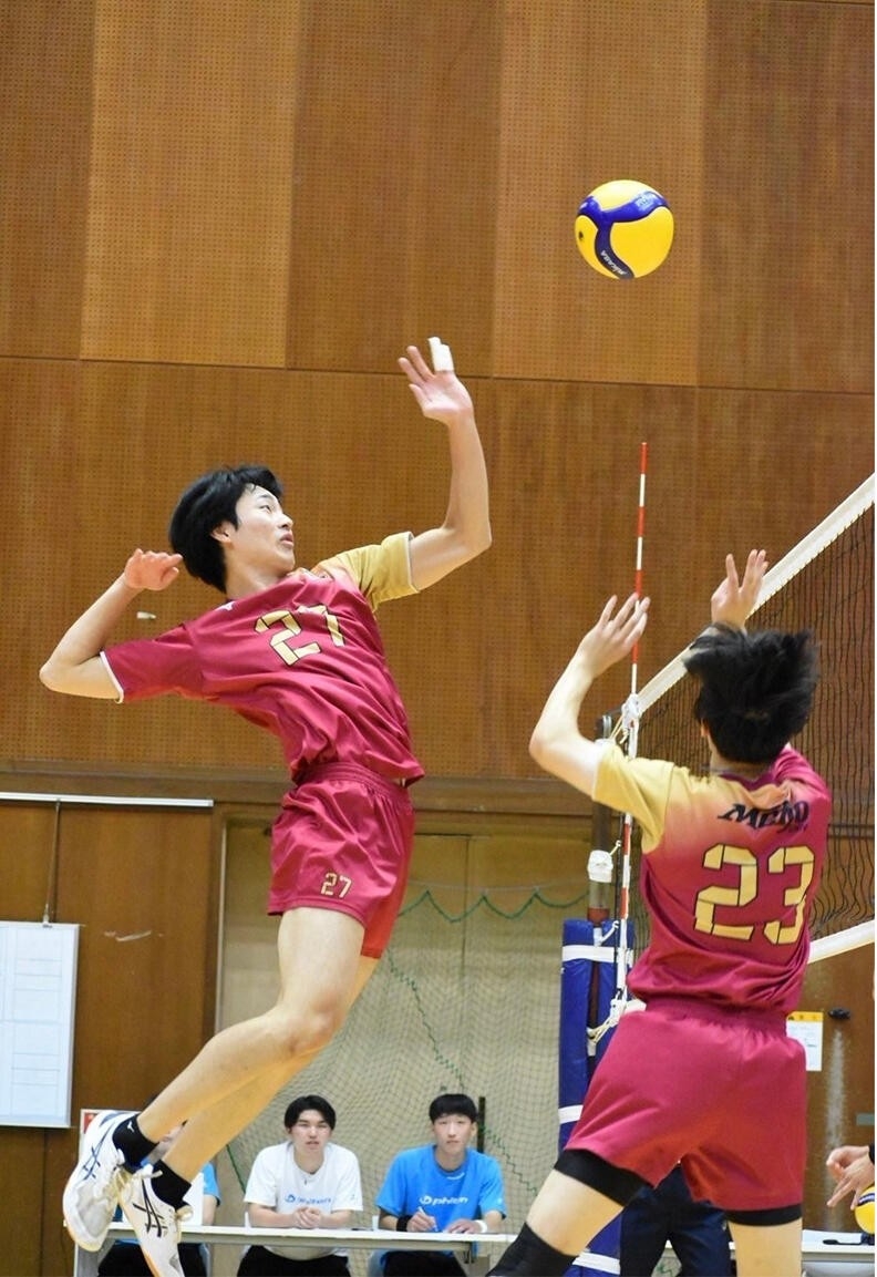 FISUワールドユニバーシティゲームズに向けた東西大学男子強化合宿に西日本代表として選出されたキャプテンの髙田康平選手(経営学部4年生)と、チーム最高打点から相手コートに叩き込むスパイクを打つ白熊太陽選手(経営学部3年生)の両エースが得点を量産すれば、全日本インカレで結果を残せるでしょう。応援よろしくお願い致します。