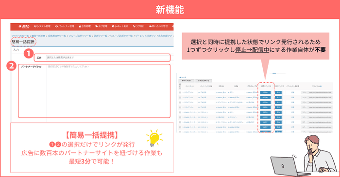 「簡易一括提携機能」は、広告とパートナーの紐づけをより効率的に行うための機能です。
